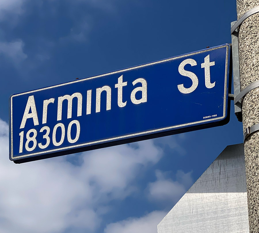 First laid out in 1922 between Fair and Vineland on a tract owned by Irvine Willard Biggar (1865-1942), who had been selling real estate around Sun Valley (then called Roscoe) and Burbank for a decade. (Born in New York, he spent most of his pre-California life around Kansas City.) The mortgagee was Jennie Ann Patton (née Richardson, 1869-1951). Arminta was a woman’s name in those days, albeit an uncommon one: I found only five Armintas in early 1920s city directories, with probably a few more unlisted. Certainly neither Biggar nor Patton had any in their families. But get this: Biggar’s parents Thomas and Margaret hailed from County Antrim, (Northern) Ireland – and “Arminta” is nearly an anagram of “Antrim”. Dismiss this theory as crackpot if you wish, but until I come across a more plausible etymology, I posit that Biggar was honoring his ancestral homeland with a little wordplay.