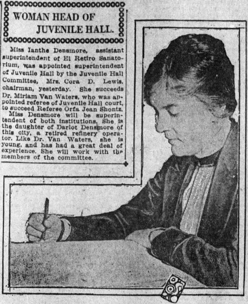 Most likely named after Darlot Densmore (1856-1926) and/or his family. This street was christened in 1916 on the Encino Acres tract, owned and developed by William H. Hay. At that time, Hay and his second wife Katherine had a home at the southeast corner of Sunset Boulevard and Havenhurst Drive in present-day West Hollywood. (Like the WeHo street, the Valley’s Hayvenhurst Avenue takes its name from Hay.) Their next-door neighbors? The Densmores, at Sunset and Crescent Heights. Society columns of the day also showed them as guests at the Hays’ social functions, so there’s a solid argument that Densmore Avenue was Hay’s friendly gift to them. Darlot Densmore was a Pennsylvania chap who dabbled in fruit canning and oil refining but arguably lived in the shadow of his father Emmet (1837-1911), an influential physician, inventor, and diet guru. After years of hopping around, the younger Densmore settled in Signal Hill in 1906 with his Irish-born wife Margaret (1864-1936) and Canadian-born daughter Ianthe (1892-1970). (Their property was probably owned by Emmet.) The trio relocated to Crescent Heights in 1914 but moved on around six years later. They ultimately wound up in Altadena.
