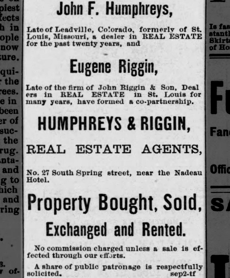 Eugene H. Riggin (1839-1930) subdivided a good deal of this neighborhood in the late 19th century, whether with his business partner John Ford Humphreys or with his sister Isabella Thornton (see Riggin Street for more on her). Born and raised in St. Louis, Riggin joined his father John in real estate when he was twenty-one. (In an event that made the local news, a meteorite the size of a robin’s egg crashed through the Riggin & Son office window in July 1862.) Riggin, along with his sister and their father, moved to Los Angeles in 1882; all three had lost their spouses, suggesting a shared desire for a change of scenery. (Riggin’s wife Dorothy died in 1876, leaving behind one child, James, who was raised by his maternal grandparents. Riggin married his second wife Ella Hack, twenty years his junior, in L.A. in 1892. They had no kids.) Eugene Street was named either on an 1893 tract owned by his sister or on an 1886 tract he owned with Humphreys. There was also once a John Street close by, presumably honoring Dad. It’s now North McDonnell Avenue.