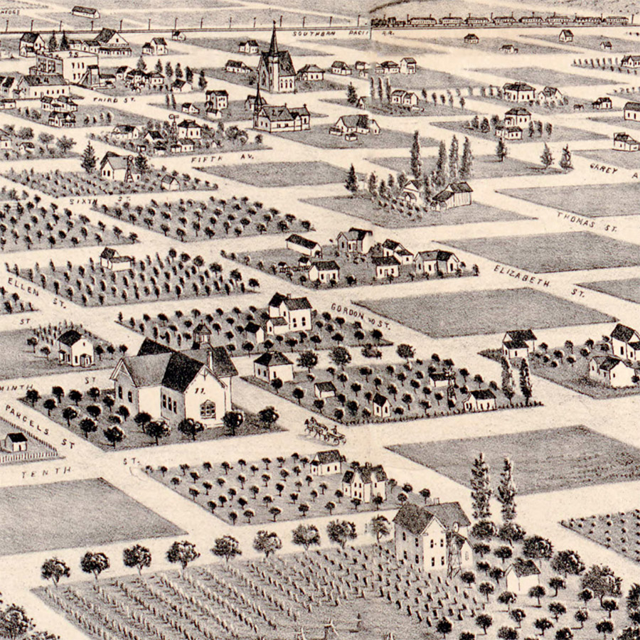 Named for Azusa farmer John Turberville Gordon (1826-1916) as his reward for helping establish Pomona. Officially, Gordon was VP of the syndicate that founded the town in 1875 – the Los Angeles Immigration and Land Co-operative Association – but he was most likely just an investor. What we know of Gordon’s early life comes from his obituary, which hailed him as “Azusa’s most distinguished citizen.” He was born in Washington, D.C.; became a sailor boy at fourteen and remained at sea for five years; obtained a law degree in the 1850s; sided with the Confederates during the Civil War and was purser on a supply ship for them; came to El Monte in 1868. He finally settled in Azusa in 1870 and served as that town’s first justice of the peace. He married Emma Jane Gordon (1845-1922; her maiden name was Gordon) in 1875 and had three children with her. J.T. Gordon spent the 1870s as a beekeeper but moved on to growing citrus in the 1880s.