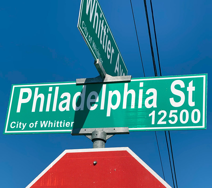 As with the other Uptown roadways mapped out by Whittier’s Quaker founders in 1887, Philadelphia Street has a Quaker connection: Philadelphia, PA was originally designed as a sanctuary city for those of the Quaker faith, a.k.a. the Religious Society of Friends. English Quaker William Penn (1644-1718), who also has an honorary street here in Whittier, was granted land in the American colony in 1681. The land was dubbed Pennsylvania (“Penn’s Woods”) and Penn sailed out to establish Philadelphia there in 1682. The city’s name does indeed mean “brotherly love” in Greek and it reflected Penn’s dreams for Philadelphia as a pacifist, abolitionist utopia.