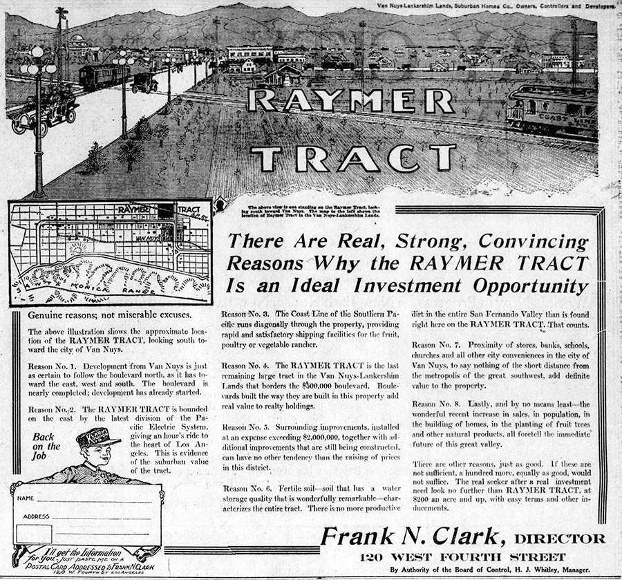 Raymer was the name of a train station built here in 1898 (supposedly, that is; the earliest reference I found was in 1905). Then in 1913 there came the Raymer tract. Raymer Street itself was named in 1917. So who was this Raymer? No one knows. The most prominent Angeleno by that name was Amos Raymer (1853-1928), an insurance man who speculated in real estate and mining. Those qualifications would make him a no-brainer namesake in those days, yet he had no apparent connections to the Valley or to the railroad. A distant second would be George Raymer of the Chicago, Burlington & Quincy Railroad, but only because the tiny Colorado town of Raymer was named for him in 1888. He may have never come to California – his railroad didn’t – so he’s a stretch. Yet no other Raymer comes close. Showbiz trivia: Talk show host Conan O’Brien unsuccessfully lobbied to get a portion of Raymer Street named for himself in 2011. I don’t think he was very serious about it.