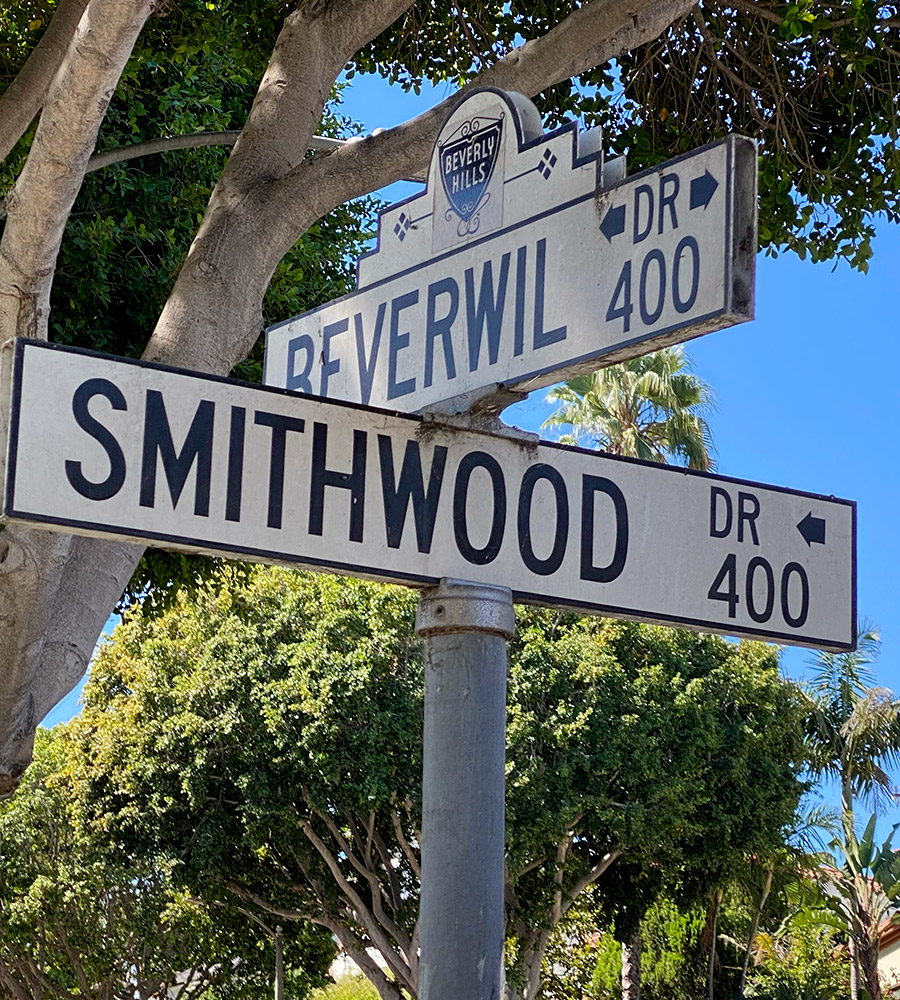 Almost assuredly named for realtor Ray C. Smith, who set up the Wilshire Heights of Beverly Hills tract here in 1923-1924 with Walter P. English and someone named Cline. (See Beverwil Drive.) Later in 1924, the tract was rechristened Beverly Hills Heights by Frank L. Meline, with Smith retained as sales manager. A map of the defunct Wilshire Heights reveals that Smithwood Drive was originally called English Avenue; the renaming might have been Smith’s little revenge against his ex-partner. Details on Smith’s life are otherwise scant, given his common name. He was still in real estate as of 1949, focusing on Palm Springs and Morongo Valley, but that’s all I know for sure.